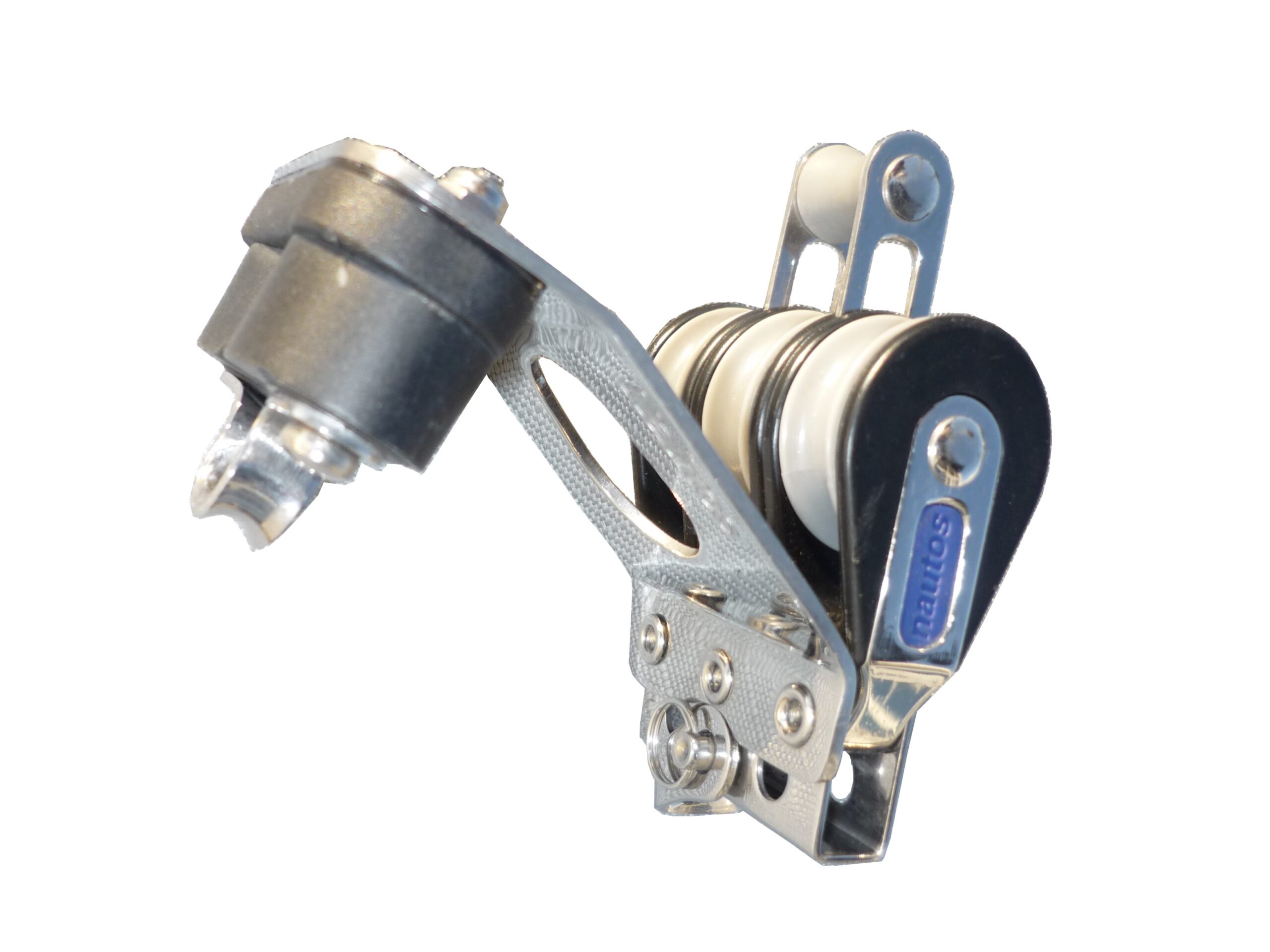 Nautos triple pulley – 3 plastic 28 mm ball-bearing sheaves, cleat stopper, 27 mm axle spacing, with becket eye; special clearance offer while supplies last.