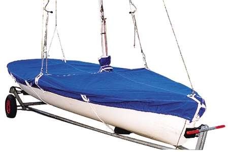 470 dinghy top cover in cotton/polyester fabric. Elegant finish, with cross straps fitted with quick-release buckles to securely fasten your cover. Flaps with Velcro closures on all openings (zip, chainplates, shrouds, etc.). The cover can be used both with the boat rigged (mast stepped) and for road transport.