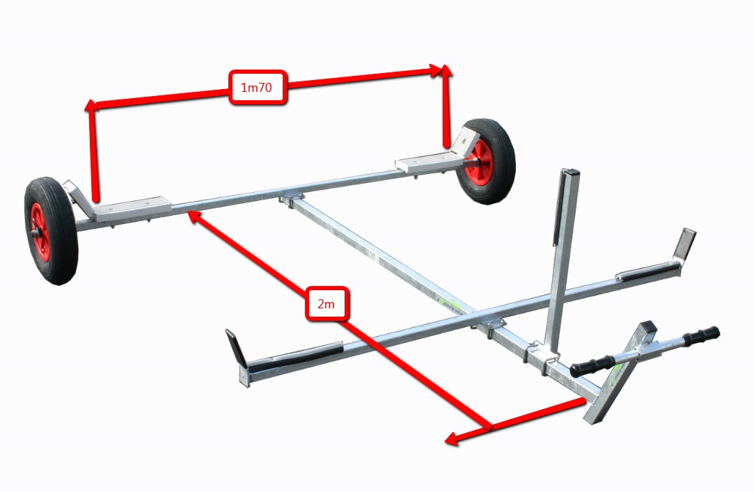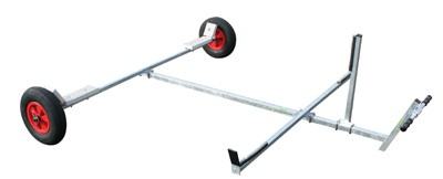 Launching trolley for small catamaran. Features 2 wheels (400 mm) and comes with a tiller. Model 2.