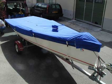 Made in France. Class Cup or Skeel top cover in acrylic/polyester fabric. ELEGANCE finish, with transverse straps fitted with click-clack buckles to securely fasten the cover. Flaps with Velcro on all openings (zip, pad eye, shrouds, etc.). The cover can be used both with the mast stepped and for road transport.