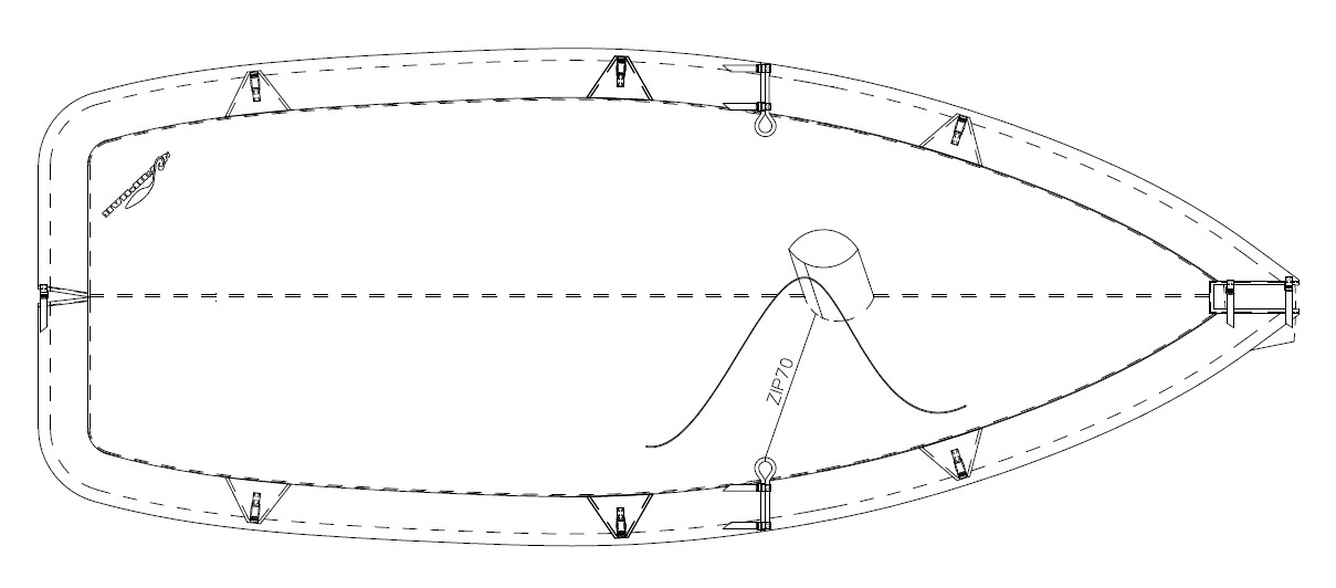 Kiss top cover in ripstop polyester. Covers the entire top of the boat. Features flaps extending 20 cm below the gunwale. A bungee cord in the perimeter hem ensures a snug fit. Equipped with retaining straps with click-clack buckles. Can be installed for transport or with the mast stepped.