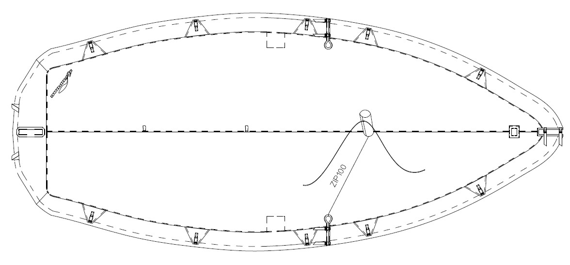 Covers the entire top of the boat. Equipped with strips extending 20 cm below the chine. An elastic cord in the hem ensures a snug fit. Fitted with retention straps with click-clasp fasteners. Can be installed for transport or with the boat rigged.