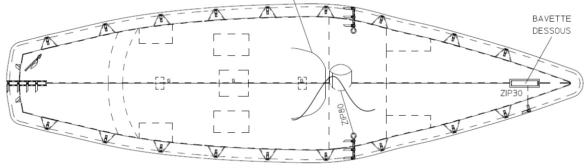 Soling top cover in ripstop polyester. Covers the entire top of the boat, with panels extending 20 cm below the gunwale. An elastic cord in the hem ensures a snug fit. Equipped with securing straps with click-clack fasteners. Can be used for transport or with the boat rigged.