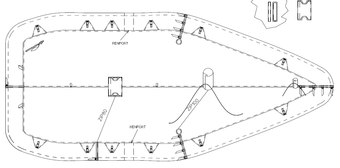 Fabriqué en France. Recouvre tout le dessus du bateau. Il est muni de bandes descendant 20 cm sous le liston. Un sandow dans l’ourlet de pourtour permet un placage efficace. Muni de sangles de maintient avec clic-clac. Il peut être installé pour le transport, ou bateau mâté.