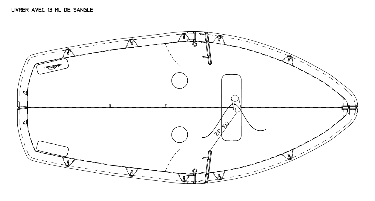 tissu de type « bâche », sur base d’un polyester 550dtex/1100dtex enduit PVC sur la face extérieure assurant une étanchéité parfaite et une grande facilité de nettoyage à l’éponge. Le grammage est de 520 g/m². Ce tissu est fabriqué en Europe.